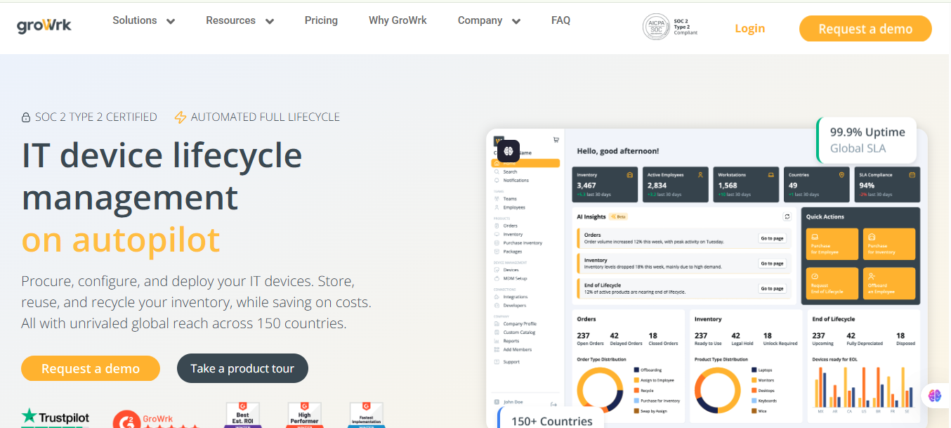 Flexibility to grow: GroWrk is designed to handle IT asset management at scale, offering flexible pricing models that include platform fees and pay-as-you-go options. This makes it a robust and future-proof choice for rapidly growing or large remote teams.