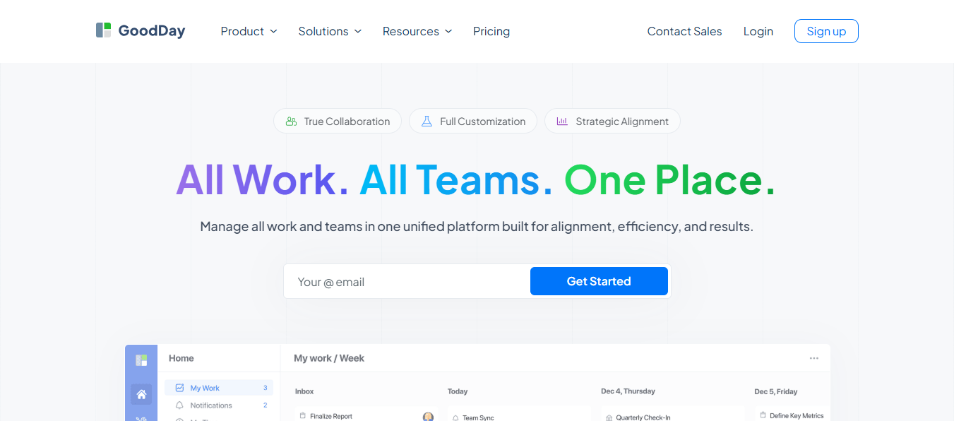 GoodDay is a high level work management platform that integrates project planning, task tracking, and resource management into a single interface. It is designed to improve organizational transparency and productivity by offering highly customizable workflows that cater to diverse methodologies like Agile, Lean, and traditional project management.