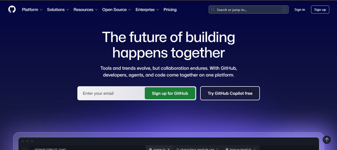 GitHub is the world's leading development platform, providing hosting for software development and version control using Git. It fosters collaboration by allowing developers to track code changes, manage repositories, and participate in open source projects through a social coding environment equipped with powerful automation and security tools.