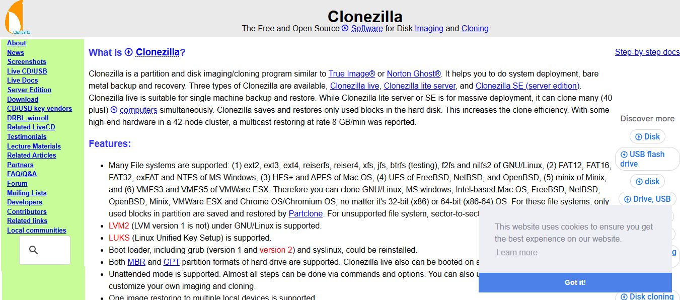 Clonezilla is a partition and disk imaging program similar to True Image or Norton Ghost. It helps with system deployment, bare metal backup, and recovery. By saving and restoring only used blocks in the hard disk, it increases efficiency during large scale cloning operations across multiple computers.